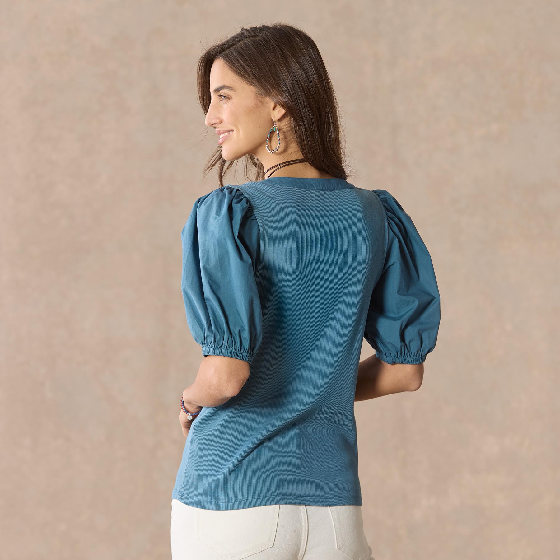 Our classic henley with a touch of feminine beauty featuring poplin sleeves and placket. laundry buttons and contract lace at the back neckline. Elastic cuffs. Cotton/spandex. Machine wash. Imported. Exclusive. Sizes XXS (00). XS (0–2). S (4–6). M (8–10). L (12–14). XL (16–18). Approx. 23l.