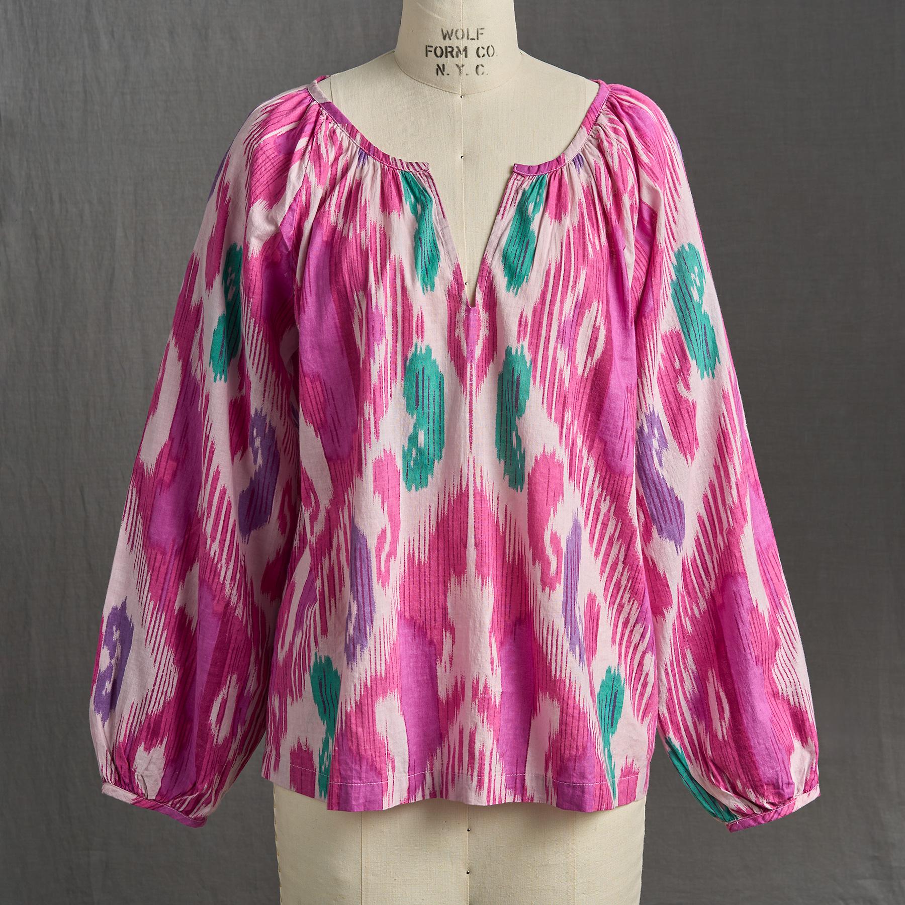 A vibrant ikat print makes a beautiful statement on this airy top with notch neckline. bracelet-length blouson sleeves and straight hem. Shirring at neckline and cuffs. Cotton. Machine wash. Imported. Sizes XS (4). S (6). M (8–10). L (12). XL (14). XXL (16). Approx. 25l.