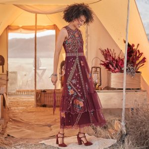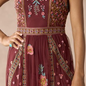 Our lovely fit and flare embroidered mesh dress features pretty florals mixed with geometric embroidery and a beautiful jewel neckline. Side zipper for an easy fit. Nylon. Hand wash. Imported. Exclusive. Sizes XS (0?C2). S (4?C6). M (8?C10). L (12?C14). XL (16?C18). XXL (20?C22). Approx. 54l.
