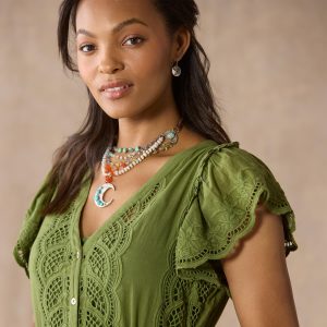 Allover embroidery and soft eyelet tiers add the most feminine touch to our sophisticated V-neck dress with scalloped ruffles at the sleeves. button front placket and a removable belt. Separate slip included. side seam pockets. Cotton. Hand wash. Imported. Exclusive. Sizes XXS (00). XS (0??). S (4??). M (8??0). L (12??4). XL (16??8). Approx. 46l.