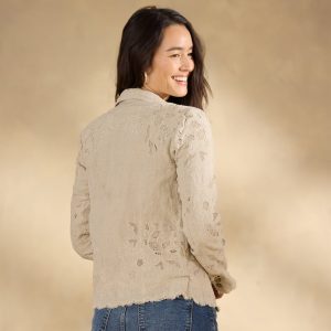 Meet the prettiest piece in your warm-weather wardrobe: Teresa! Shockingly versatile. this tailored lace jacket is a stunner dressed up. over a simple shift—or dressed down with your favorite jeans. All-over embroidered cutwork lace with raw scalloped hem. Welt pockets. Ramie. Machine wash. Imported. Exclusive. Sizes XXS (00). XS (0–2). S (4–6). M (8–10). L (12–14). XL (16–18). Approx. 21.5l.